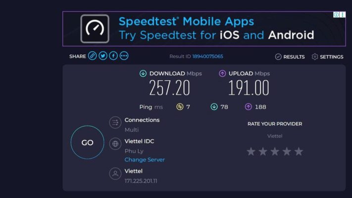 Kiểm tra tốc độ internet bằng Speedtest by Ookla là cách đơn giản và nhanh nhất để biết chất lượng mạng đang sử dụng. Chỉ cần vài thao tác đơn giản, bạn có thể kiểm tra được tốc độ Download, Upload và độ ổn định của đường truyền.