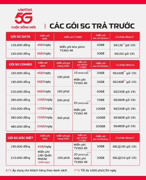 | 5G150 | 150.000đ | 6GB/ngày (180GB/tháng) + TV360 Basic |