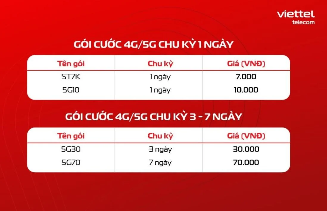 Các gói cước 5G Viettel theo chu kỳ ngắn ngày