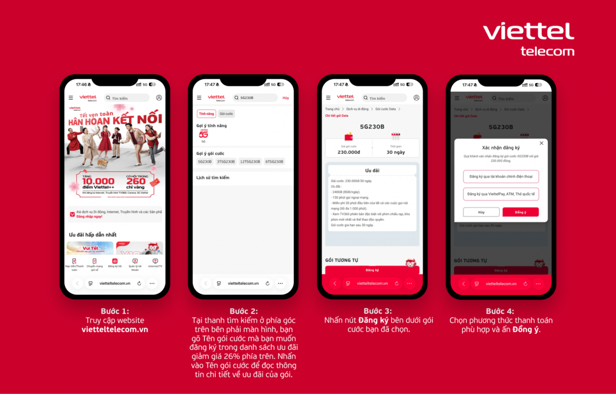GIẢM GIÁ 26% KHI MUA GÓI CƯỚC TRÊN ỨNG DỤNG MYVIETTEL VÀ WEBSITE VIETTELTELECOM.VN Từ ngày 23/02/2026 – 03/03/2026, Viettel triển khai chương trình chào xuân 2026, giảm ngay 26%...